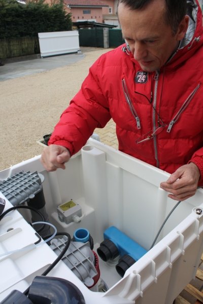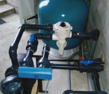 Le by-pass a été mis en oeuvre car le débit de la pompe est élevée (piscine 80m3). Par la fenêtre en polycarbonate on peut voir des micros-bulles comme un brouillard.