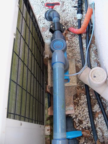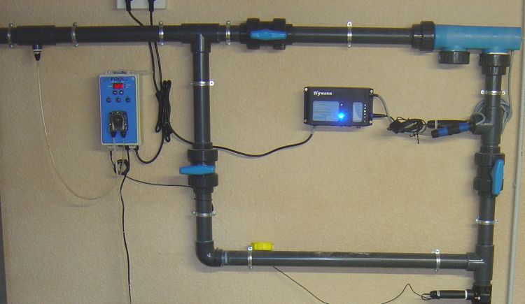 Montage by-pass 3 voies réalisé par un client. La tuyauterie peut-être plus courte. Comme le local est très grand, il n'y a pas d'inconvénient à utiliser l'espace. On distingue la sonde pH de mesure à gauche et l'injection à droite. Le clapet anti-retour est bien installé.