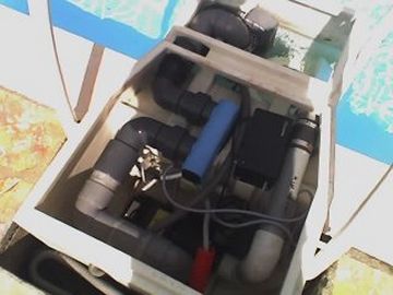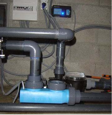 Le by-pass a été mis en oeuvre car le débit de la pompe est élevée (piscine 80m3). Par la fenêtre en polycarbonate on peut voir des micros-bulles comme un brouillard.