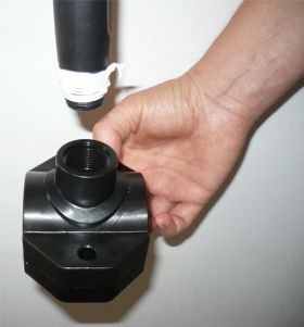Voici l'aspiration et son filtre qui sont tenus par la main. Sur le côté gauche il s'agit du flotteur. Les 2 parties sont reliées entre elles à l'aide de la partie étroite (ovale vue du dessus). L'ensemble est plongé dans le bidon correcteur de pH. Afin de procéder à l'insertion, il est indispensable d'utiliser un bidon de 20 litres, sans quoi, l'encolure du bidon de 10L qui est trop étroite vous empêchera de réaliser ce montage. Insérer cet ensemble n'est pas facile et vous demandera un peu de temps. Notre façon de le faire est de plonger le flotteur et la languette en 1er puis de visser le flotteur en maintenant l'ensemble sur le haut du bidon. Le flotteur contient un aimant et un relais reed. Lorsque le flotteur est en bas, le relais ne colle plus. Le régulateur est averti que le bidon est vide et le signale par un témoin lumineux..